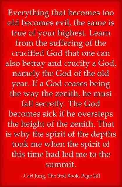 Everything that becomes too old becomes evil, the same is true of your highest. Learn from the suffering of the crucified God that one can also betray and crucify a God, namely the God of the old year. If a God ceases being the way the zenith, he must fall secretly. The God becomes sick if he oversteps the height of the zenith. That is why the spirit of the depths took me when the spirit of this time had led me to the summit. ~Carl Jung, The Red Book, Page 241.