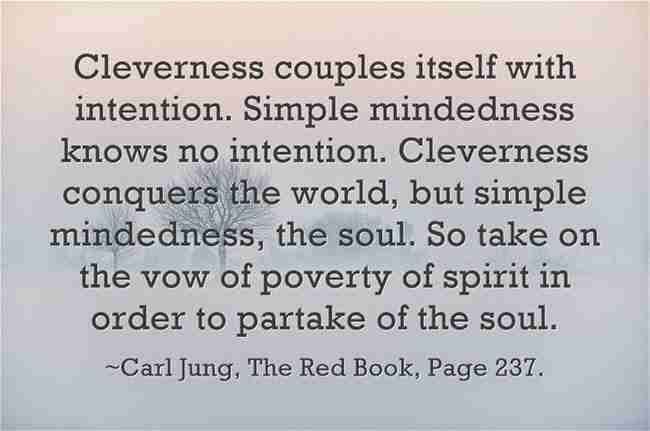 Cleverness couples itself with intention. Simplemindedness knows no intention. Cleverness conquers the world, but simplemindedness, the soul. So take on the vow of poverty of spirit in order to partake of the soul. ~Carl Jung, The Red Book, Page 237.