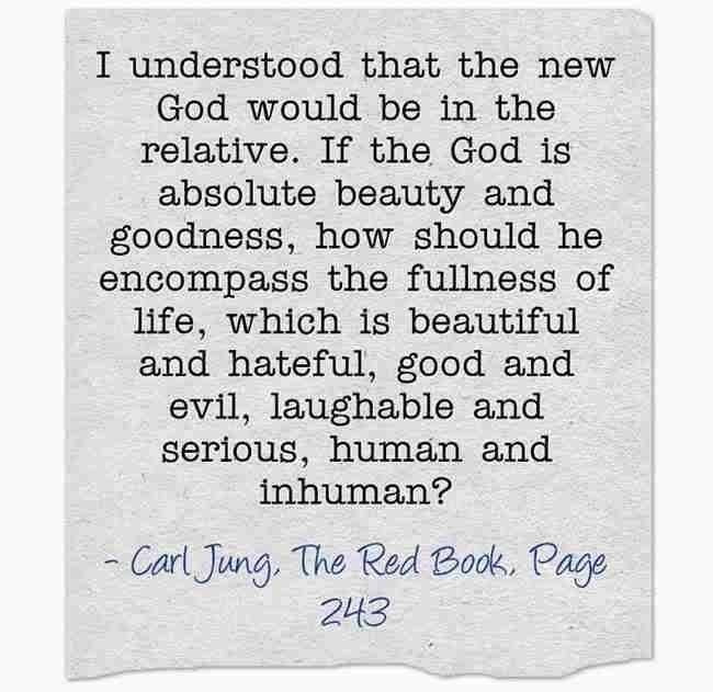 I understood that the new God would be in the relative. If the God is absolute beauty and goodness, how should he encompass the fullness of life, which is beautiful and hateful, good and evil, laughable and serious, human and inhuman? ~Carl Jung, Liber Novus, Page 243.