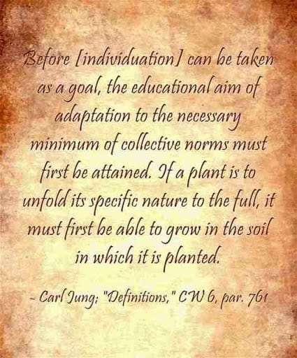 Before [individuation] can be taken as a goal, the educational aim of adaptation to the necessary minimum of collective norms must first be attained. If a plant is to unfold its specific nature to the full, it must first be able to grow in the soil in which it is planted. ~Carl Jung; CW 6, par. 761.