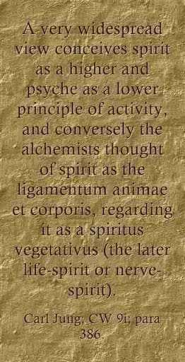 A very widespread view conceives spirit as a higher and psyche as a lower principle of activity, and conversely the alchemists thought of spirit as the ligamentum animae et corporis, regarding it as a spiritus vegetativus (the later life-spirit or nerve-spirit). ~Carl Jung, CW 9i, para. 386.