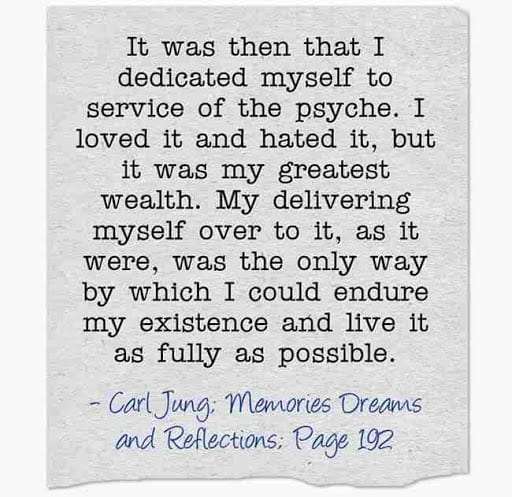 It was then that I dedicated myself to service of the psyche. I loved it and hated it, but it was my greatest wealth. My delivering myself over to it, as it were, was the only way by which I could endure my existence and live it as fully as possible. ~Carl Jung; Memories Dreams and Reflections; Page 192.