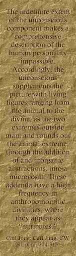 The indefinite extent of the unconscious component makes a comprehensive description of the human personality impossible. Accordingly, the unconscious supplements the picture with living figures ranging from the animal to the divine, as the two extremes outside man, and rounds out the animal extreme, through the addition of and inorganic abstractions, into a microcosm. These addenda have a high frequency in anthropomorphic divinities, where they appear as “attributes.” ~Carl Jung; Carl Jung, CW 9i, para. 314-315