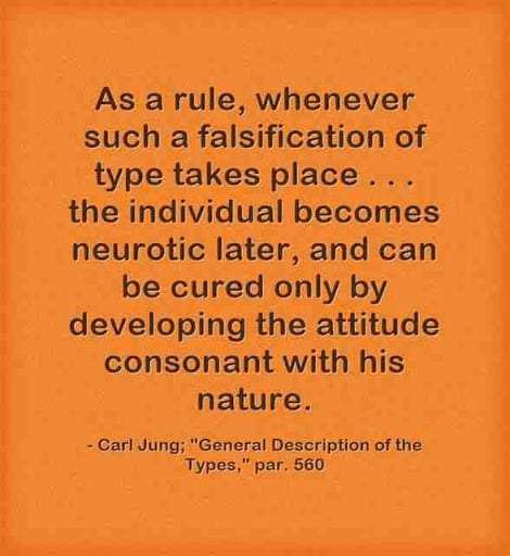 As a rule, whenever such a falsification of type takes place . . . the individual becomes neurotic later, and can be cured only by developing the attitude consonant with his nature. ~Carl Jung, CW 6, Para 560.
