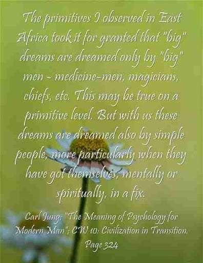 The primitives I observed in East Africa took it for granted that “big” dreams are dreamed only by “big” men – medicine-men, magicians, chiefs, etc. This may be true on a primitive level. But with us these dreams are dreamed also by simple people, more particularly when they have got themselves, mentally or spiritually, in a fix. ~Carl Jung. CW 10, Page 324.