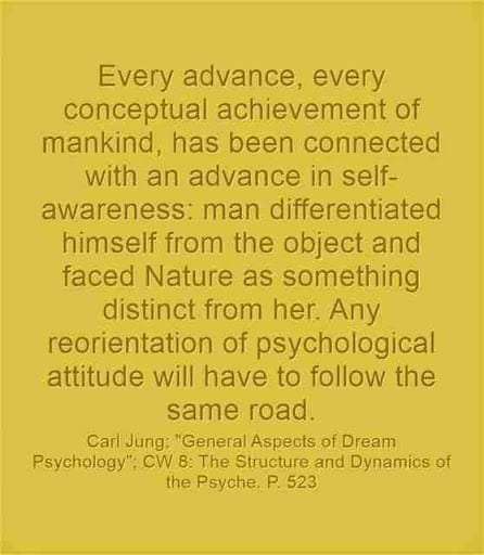 Every advance, every conceptual achievement of mankind, has been connected with an advance in self-awareness: man differentiated himself from the object and faced Nature as something distinct from her. Any reorientation of psychological attitude will have to follow the same road. ~Carl Jung, CW 8, Page 523.