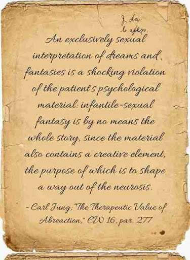 An exclusively sexual interpretation of dreams and fantasies is a shocking violation of the patient’s psychological material: infantile-sexual fantasy is by no means the whole story, since the material also contains a creative element, the purpose of which is to shape a way out of the neurosis. ~Carl Jung, CW 16, Para 277.