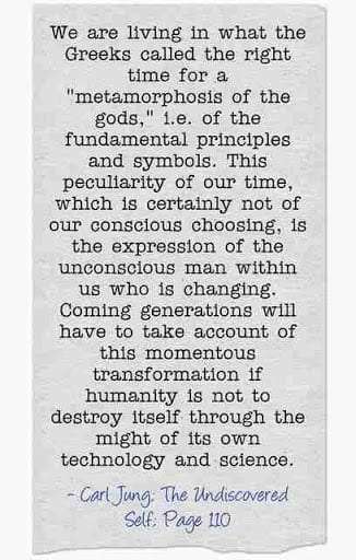 We are living in what the Greeks called the right time for a “metamorphosis of the gods,” i.e. of the fundamental principles and symbols. This peculiarity of our time, which is certainly not of our conscious choosing, is the expression of the unconscious man within us who is changing. Coming generations will have to take account of this momentous transformation if humanity is not to destroy itself through the might of its own technology and science. ~Carl Jung; The Undiscovered Self; Page 110.