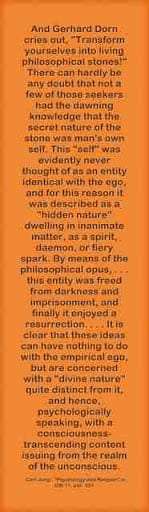 And Gerhard Dorn cries out, “Transform yourselves into living philosophical stones!” There can hardly be any doubt that not a few of those seekers had the dawning knowledge that the secret nature of the stone was man’s own self. This “self” was evidently never thought of as an entity identical with the ego, and for this reason it was described as a “hidden nature” dwelling in inanimate matter, as a spirit, daemon, or fiery spark. By means of the philosophical opus, . . . this entity was freed from darkness and imprisonment, and finally it enjoyed a resurrection. . . . It is clear that these ideas can have nothing to do with the empirical ego, but are concerned with a “divine nature” quite distinct from it, and hence, psychologically speaking, with a consciousness-transcending content issuing from the realm of the unconscious. ~Carl Jung, CW 11, para 154.