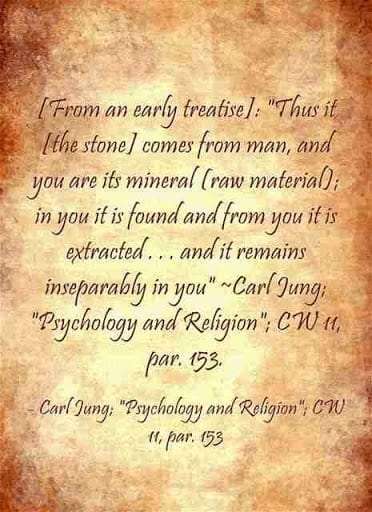 [From an early treatise]: “Thus it [the stone] comes from man, and you are its mineral (raw material); in you it is found and from you it is extracted . . . and it remains inseparably in you” ~Carl Jung, CW 11, para 53