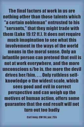 The final factors at work in us are nothing other than those talents which “a certain nobleman” entrusted to his “servants,” that they might trade with them (Luke 19:12 ff.). It does not require much imagination to see what this involvement in the ways of the world means in the moral sense. Only an infantile person can pretend that evil is not at work everywhere, and the more unconscious s/he is, the more the devil drives her/him. . . . Only ruthless self-knowledge o the widest scale, which sees good and evil in correct perspective and can weigh up the motives of human action, offers some guarantee that the end result will not turn out too badly ~Carl Jung, CW 9ii, Para 255.
