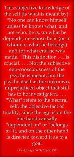 This subjective knowledge of the self [is what is meant by]: “No one can know himself unless he knows what, and not who, he is, on what he depends, or whose he is (or to whom or what he belongs) and for what end he was made.” This distinction . . . is crucial. . . . Not the subjective ego-consciousness of the psyche is meant, but the psyche itself as the unknown, unprejudiced object that still has to be investigated. . . . “What” refers to the neutral self, the objective fact of totality, since the ego is on the one hand causally “dependent on” or “belongs to” it, and on the other hand is directed toward it as to a goal ~Carl Jung, CW 9ii, para 252.