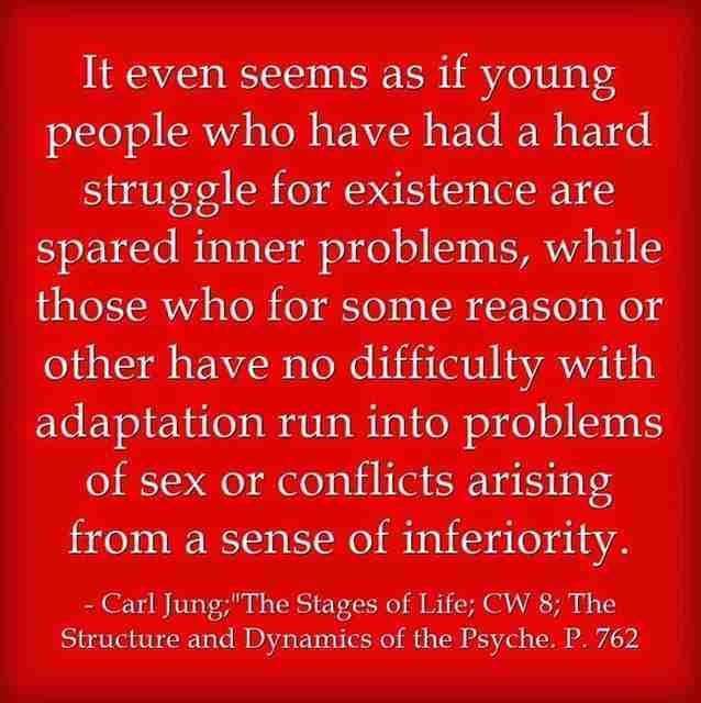 It even seems as if young people who have had a hard struggle for existence are spared inner problems, while those who for some reason or other have no difficulty with adaptation run into problems of sex or conflicts arising from a sense of inferiority. ~Carl Jung, CW 8, Page 762
