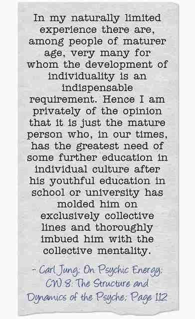 In my naturally limited experience there are, among people of maturer age, very many for whom the development of individuality is an indispensable requirement. Hence I am privately of the opinion that it is just the mature person who, in our times, has the greatest need of some further education in individual culture after his youthful education in school or university has molded him on exclusively collective lines and thoroughly imbued him with the collective mentality. ~Carl Jung, CW 8, Para 112