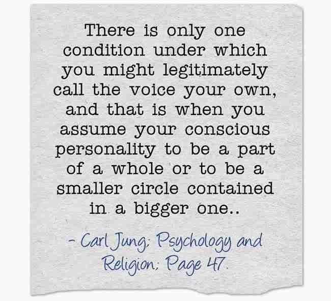 There is only one condition under which you might legitimately call the voice your own, and that is when you assume your conscious personality to be a part of a whole or to be a smaller circle contained in a bigger one.. ~Carl Jung, CW 11, Page 47.