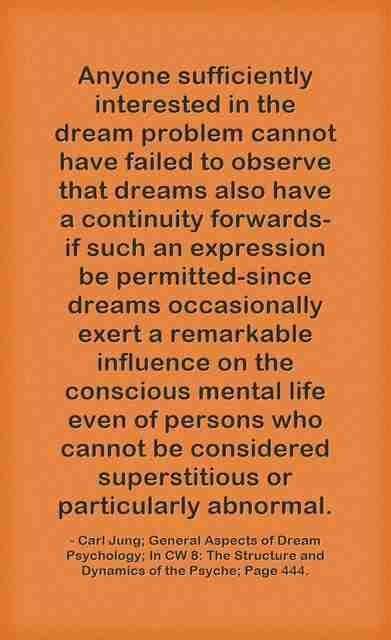 Anyone sufficiently interested in the dream problem cannot have failed to observe that dreams also have a continuity forwards-if such an expression be permitted-since dreams occasionally exert a remarkable influence on the conscious mental life even of persons who cannot be considered superstitious or particularly abnormal. ~ Carl Jung, CW 8, Page 444