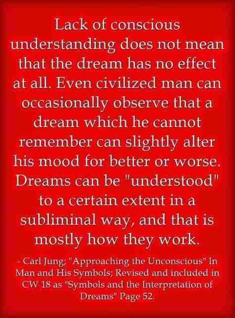 Lack of conscious understanding does not mean that the dream has no effect at all. Even civilized man can occasionally observe that a dream which he cannot remember can slightly alter his mood for better or worse. Dreams can be “understood” to a certain extent in a subliminal way, and that is mostly how they work. ~Carl Jung, CW 18, Page 52.