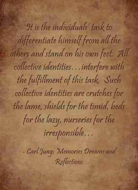 It is the individuals’ task to differentiate himself from all the others and stand on his own feet. All collective identities…interfere with the fulfillment of this task. Such collective identities are crutches for the lame, shields for the timid, beds for the lazy, nurseries for the irresponsible… ~Carl Jung; Memories Dreams and Reflections