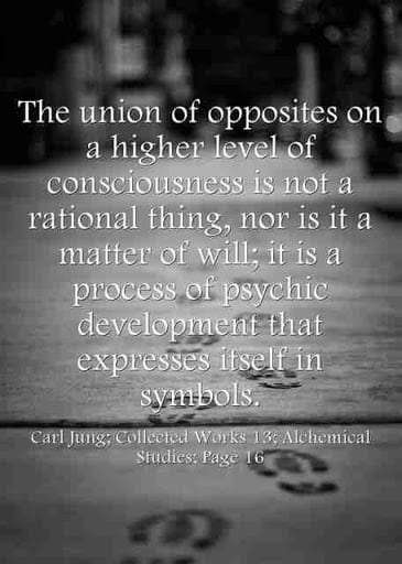 The union of opposites on a higher level of consciousness is not a rational thing, nor is it a matter of will; it is a process of psychic development that expresses itself in symbols. Carl Jung, CW 13, Page 16.