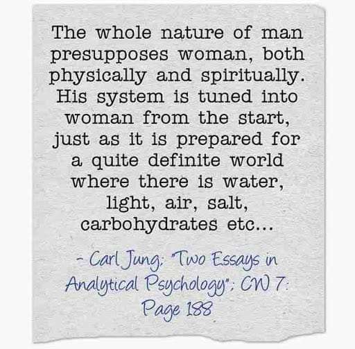 The whole nature of man presupposes woman, both physically and spiritually. His system is tuned into woman from the start, just as it is prepared for a quite definite world where there is water, light, air, salt, carbohydrates etc… ~Carl Jung, CW 7, Page 188