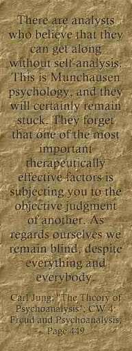 There are analysts who believe that they can get along without self-analysis. This is Munchausen psychology, and they will certainly remain stuck. They forget that one of the most important therapeutically effective factors is subjecting you to the objective judgment of another. As regards ourselves we remain blind, despite everything and everybody. Carl Jung, CW 4, Page 449.