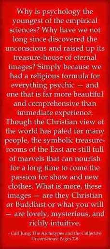 Why is psychology the youngest of the empirical sciences? Why have we not long since discovered the unconscious and raised up its treasure-house of eternal images? Simply because we had a religious formula for everything psychic — and one that is far more beautiful and comprehensive than immediate experience. Though the Christian view of the world has paled for many people, the symbolic treasure-rooms of the East are still full of marvels that can nourish for a long time to come the passion for show and new clothes. What is more, these images — are they Christian or Buddhist or what you will — are lovely, mysterious, and richly intuitive. ~Carl Jung, CW 9ii, Pages 7-8.