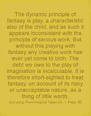 The dynamic principle of fantasy is play, a characteristic also of the child, and as such it appears inconsistent with the principle of serious work. But without this playing with fantasy any creative work has ever yet come to birth. The debt we owe to the play of imagination is incalculable. It is therefore short-sighted to treat fantasy, on account of its risky or unacceptable nature, as a thing of little worth. ~Carl Jung, CW 6, Page 82.