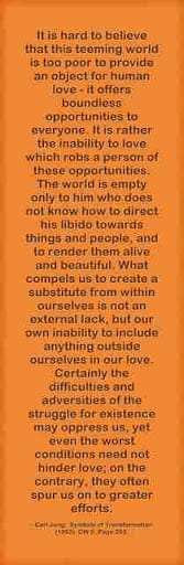 What compels us to create a substitute from within ourselves is not an external lack, but our own inability to include anything outside ourselves in our love. Certainly the difficulties and adversities of the struggle for existence may oppress us, yet even the worst conditions need not hinder love; on the contrary, they often spur us on to greater efforts. Carl Jung, CW 5, 253.