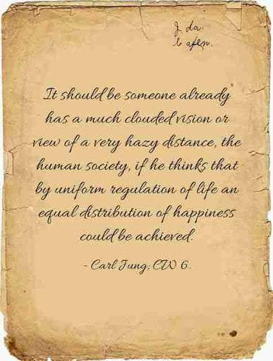 It should be someone already has a much clouded vision or view of a very hazy distance, the human society, if he thinks that by uniform regulation of life an equal distribution of happiness could be achieved. ~Carl Jung; CW 6.