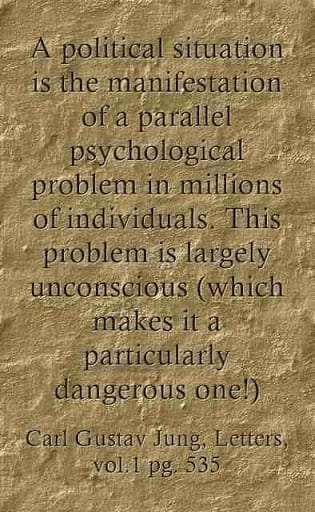 A political situation is the manifestation of a parallel psychological problem in millions of individuals. This problem is largely unconscious (which makes it a particularly dangerous one!) ~Carl Gustav Jung, Letters, Vol 1, Page 535.