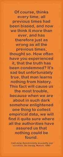 Of course, thinks every time, all previous times had been biased, and now we think it more than ever, and has therefore just as wrong as all the previous times, thought so. How often have you experienced it, that the truth has been condemned? It’s sad but unfortunately true, that man learns nothing from history. This fact will cause us the most trouble, because when we are about in such dark somehow enlightened one thing to collect empirical data, we will find it quite sure where all the authorities have assured us that nothing could be found. ~Carl Jung; Synchronicity acausality and occultism, dtv Verlag, Munich, 1990.