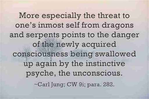 More especially the threat to one’s inmost self from dragons and serpents points to the danger of the newly acquired consciousness being swallowed up again by the instinctive psyche, the unconscious. ~Carl Jung; CW 9i; para. 282.