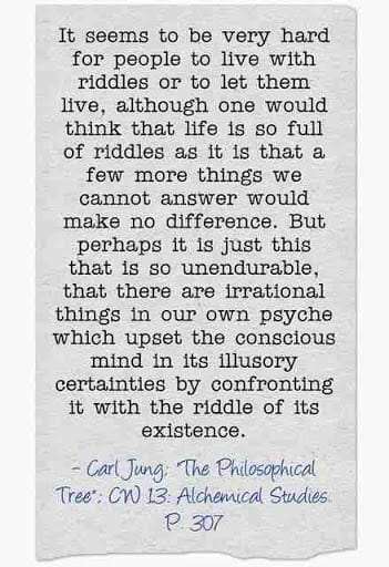 It seems to be very hard for people to live with riddles or to let them live, although one would think that life is so full of riddles as it is that a few more things we cannot answer would make no difference. But perhaps it is just this that is so unendurable, that there are irrational things in our own psyche which upset the conscious mind in its illusory certainties by confronting it with the riddle of its existence. ~Carl Jung;, CW 13, Page 307.