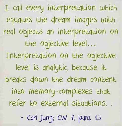 I call every interpretation which equates the dream images with real objects an interpretation on the objective level… Interpretation on the objective level is analytic, because it breaks down the dream content into memory-complexes that refer to external situations. ~Carl Jung; CW 7, para. 131.