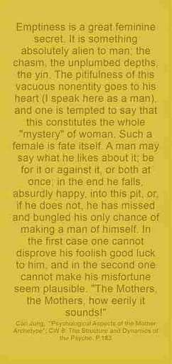 Emptiness is a great feminine secret. It is something absolutely alien to man; the chasm, the unplumbed depths, the yin. The pitifulness of this vacuous nonentity goes to his heart (I speak here as a man), and one is tempted to say that this constitutes the whole “mystery” of woman.