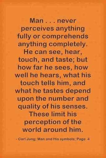 Man . . . never perceives anything fully or comprehends anything completely. He can see, hear, touch, and taste; but how far he sees, how well he hears, what his touch tells him, and what he tastes depend upon the number and quality of his senses. These limit his perception of the world around him. ~Carl Jung; Man and His symbols; Page 4.