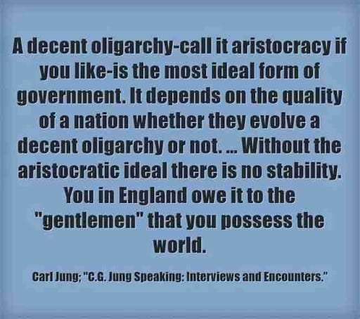 A decent oligarchy-call it aristocracy if you like-is the most ideal form of government. It depends on the quality of a nation whether they evolve a decent oligarchy or not…Without the aristocratic ideal there is not stability. You in England owe it to the “gentlemen” that you possess the world. ~Carl Jung, C.G. Jung Speaking Interviews and Encounters.