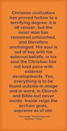 Christian civilization has proved hollow to a terrifying degree: it is all veneer, but the inner man has remained untouched and therefore unchanged. His soul is out of key with his external beliefs; in his soul the Christian has not kept pace with external developments. Yes, everything is to be found outside—in image and in word, in Church and Bible—but never inside. Inside reign the archaic gods, supreme as of old. ~Carl Jung, CW 12, Para 12