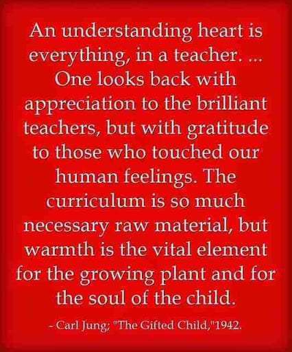 An understanding heart is everything in a teacher. One looks back with appreciation to the brilliant teachers, but with gratitude to those who touched our human feelings. The curriculum is so much necessary raw material, but warmth is the vital element for the growing plant and for the soul of the child. ~Carl Jung. “The Gifted Child.”