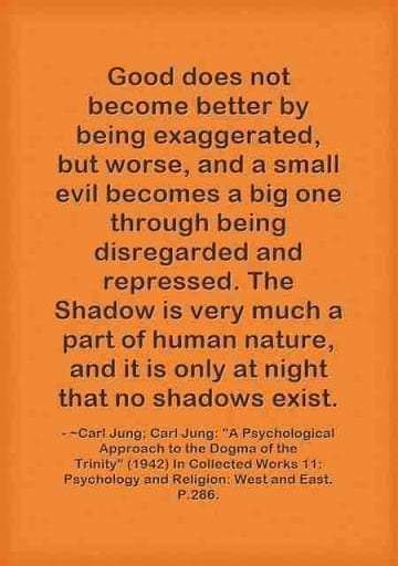 Good does not become better by being exaggerated, but worse, and a small evil becomes a big one through being disregarded and repressed. The Shadow is very much a part of human nature, and it is only at night that no shadows exist. ~Carl Jung, CW 11, Page 286.