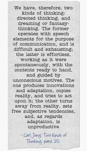 We have, therefore, two kinds of thinking: directed thinking, and dreaming or fantasy-thinking. The former operates with speech elements for the purpose of communication, and is difficult and exhausting; the latter is effortless, working as it were spontaneously, with the contents ready to hand, and guided by unconscious motives. The one produces innovations and adaptation, copies reality, and tries to act upon it; the other turns away from reality, sets free subjective tendencies, and, as regards adaptation, is unproductive ~Carl Jung, CW 5, para. 20.