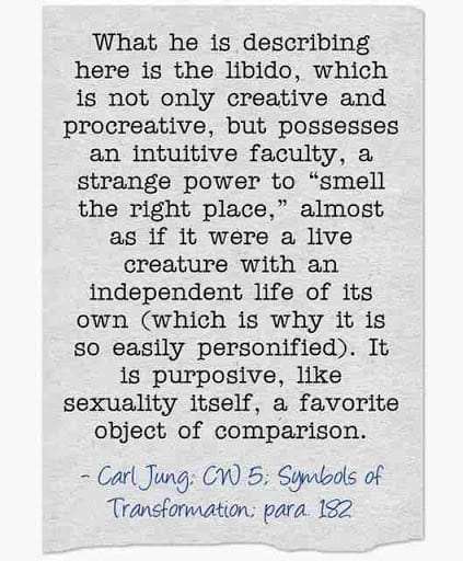 What he is describing here is the libido, which is not only creative and procreative, but possesses an intuitive faculty, a strange power to “smell the right place,” almost as if it were a live creature with an independent life of its own (which is why it is so easily personified). It is purposive, like sexuality itself, a favorite object of comparison. ~Carl Jung; CW 5, Para. 182.