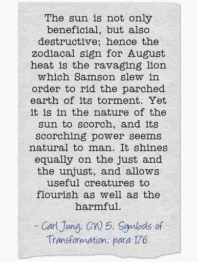 The sun is not only beneficial, but also destructive; hence the zodiacal sign for August heat is the ravaging lion which Samson slew in order to rid the parched earth of its torment. Yet it is in the nature of the sun to scorch, and its scorching power seems natural to man. It shines equally on the just and the unjust, and allows useful creatures to flourish as well as the harmful. ~Carl Jung; CW 5, para 176.