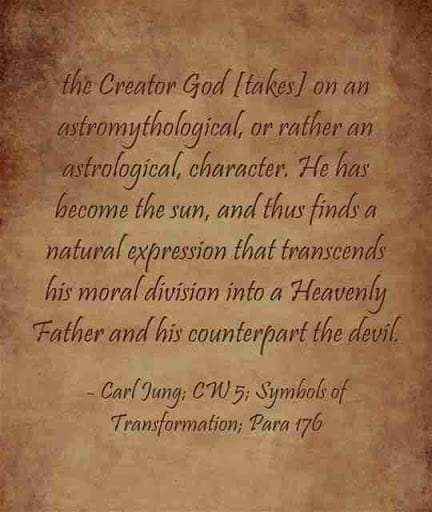 the Creator God [takes] on an astromythological, or rather an astrological, character. He has become the sun, and thus finds a natural expression that transcends his moral division into a Heavenly Father and his counterpart the devil. ~Carl Jung; CW 5, Para 176.