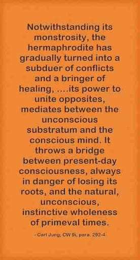 Notwithstanding its monstrosity, the hermaphrodite has gradually turned into a subduer of conflicts and a bringer of healing, ….its power to unite opposites, mediates between the unconscious substratum and the conscious mind. It throws a bridge between present-day consciousness, always in danger of losing its roots, and the natural, unconscious, instinctive wholeness of primeval times. ~Carl Jung; CW 9i, para. 292-4