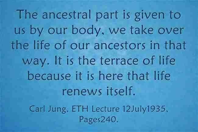 The ancestral part is given to us by our body, we take over the life of our ancestors in that way. It is the terrace of life because it is here that life renews itself. ~Carl Jung, ETH Lecture 12July1935, Pages 240.