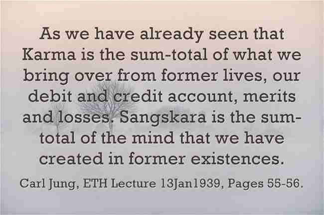 As we have already seen that Karma is the sum-total of what we bring over from former lives, our debit and credit account, merits and losses. Sangskara is the sum-total of the mind that we have created in former existences. ~Carl Jung, ETH Lecture 13Jan1939, Pages 55-56.