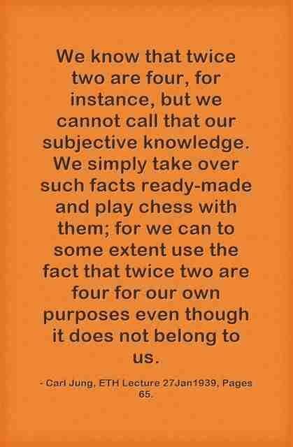 We know that twice two are four, for instance, but we cannot call that our subjective knowledge. We simply take over such facts ready-made and play chess with them; for we can to some extent use the fact that twice two are four for our own purposes even though it does not belong to us. ~Carl Jung, ETH Lecture 27Jan1939, Pages 65.