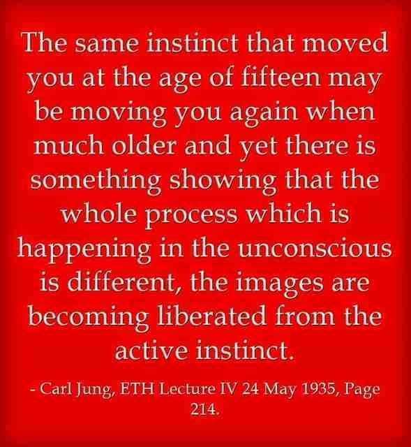 The same instinct that moved you at the age of fifteen may be moving you again when much older and yet there is something showing that the whole process which is happening in the unconscious is different, the images are becoming liberated from the active instinct. ~Carl Jung, ETH Lecture IV 24 May 1935, Pages 214.
