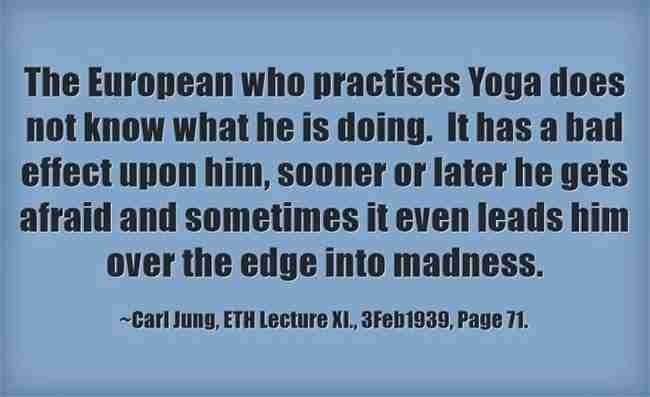 The European who practises Yoga does not know what he is doing. It has a bad effect upon him, sooner or later he gets afraid and sometimes it even leads him over the edge into madness. ~Carl Jung, ETH Lecture XI, 3Feb1939, Page 71.